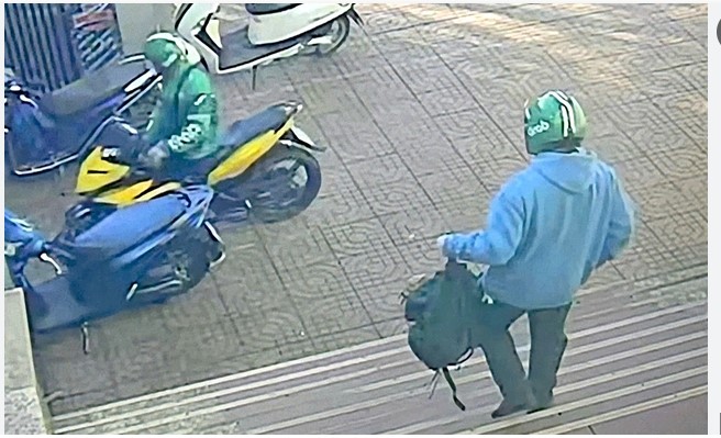 Theo đó, khoảng 15h30 ngày 19/1, có 2 đối tượng nam giới mặc trang phục áo khoác của hãng Grab, đội mũ bảo hiểm màu xanh grab, nghi vấn sử dụng xe mô tô nhãn hiệu Exciter, màu vàng đen (biển số đối tượng sử dụng 77G1 – 313.12), mang theo một túi xách màu xanh (dạng ba lô cóc) đến dừng xe trước Phòng Giao dịch Trà Bá.