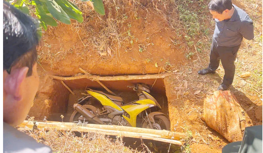 Vị trí này được lực lượng công an truy tìm, phát hiện chiếc mô tô nằm dưới hố sâu, phía trên được che lấp lại bằng tấm bạt.